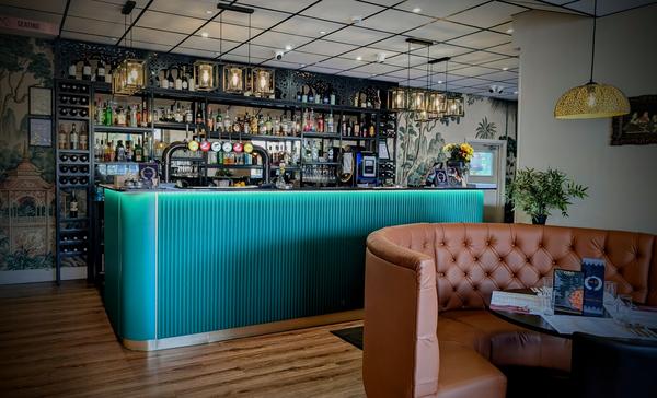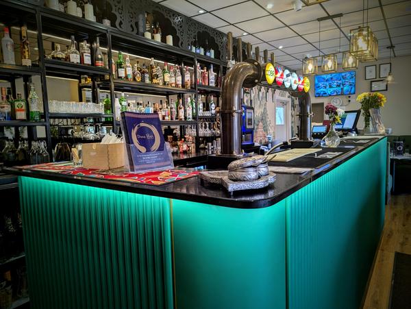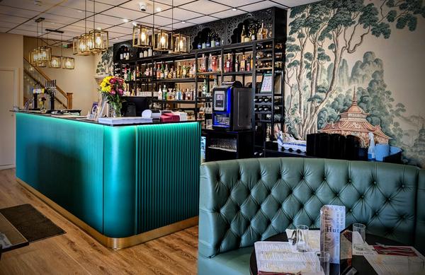 A striking forest green bar with ribbed detailing and warm brass accents, serving as the bold centerpiece of the space.